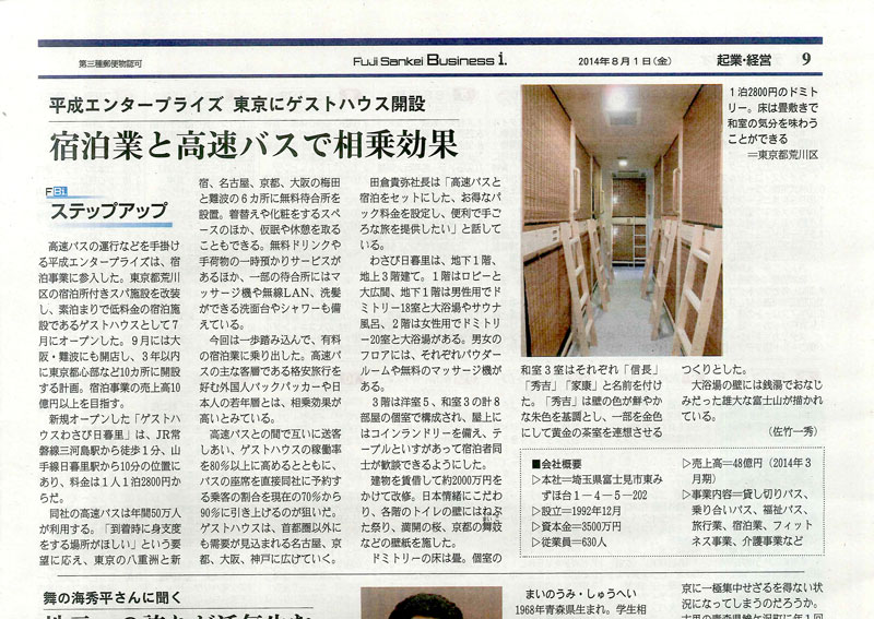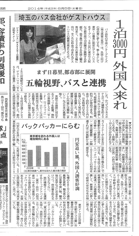 トップメディア紹介 メディア紹介 新聞 ゲストハウスわさびを紹介して頂いたメディアの一覧です。 クリックすると記事全文がご覧頂けます。 日本経済新聞(2014/8/5 掲載) フジサンケイビジネスアイ(2014/8/1 掲載) 旬刊旅行新聞(2014/8/1 掲載)